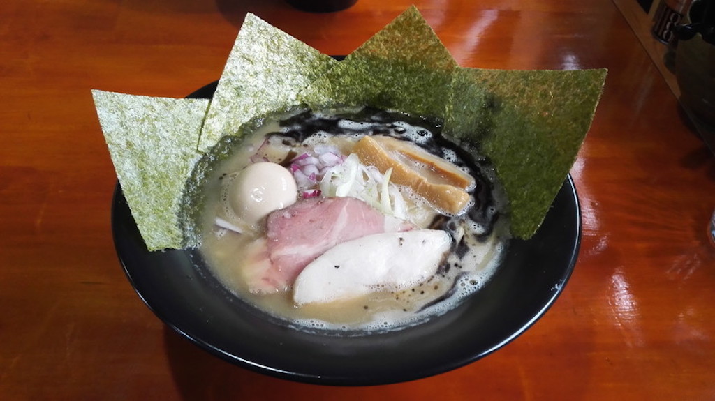 「鶏白湯ラーメンくろ+味のり」とは、鶏白湯ラーメンにマー油と味玉と海苔4枚をトッピングしたものでした。